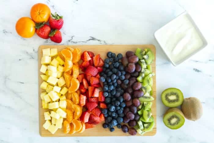 First wash and prepare all of the fruit you are using. I had the kids help with this one, too. We washed the strawberries, grapes, and blueberries. Peel the kiwi and the mandarins. If your kids are helping have them do that and use some kid friendly knives to cut the fruit into pieces.