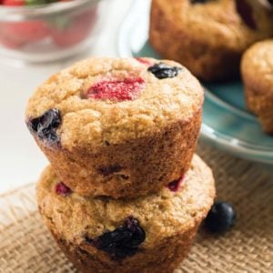 This recipe only takes 20 minutes to make, including the preparation and baking time. The prep time is only five minutes which is pretty great for a muffin recipe that doesn’t come out of a box. The ingredients are relatively simple, with the main ones being blueberries, strawberries, whole wheat flour, unsweetened apple sauce, and plain Greek yogurt to make them moist.