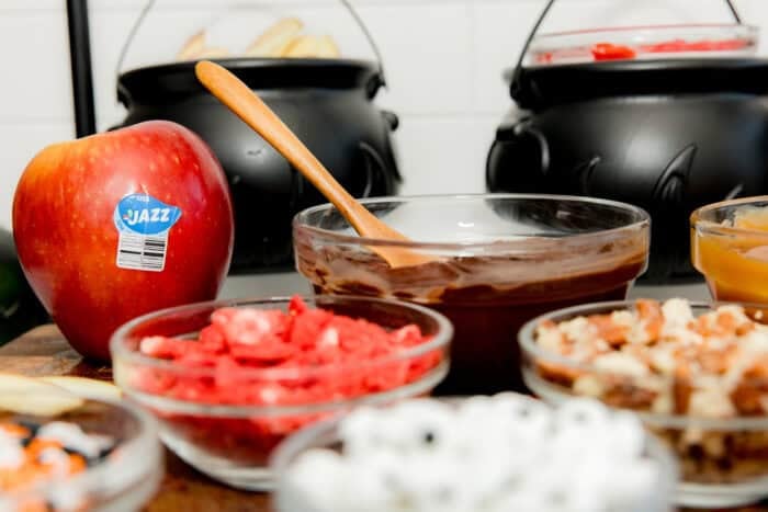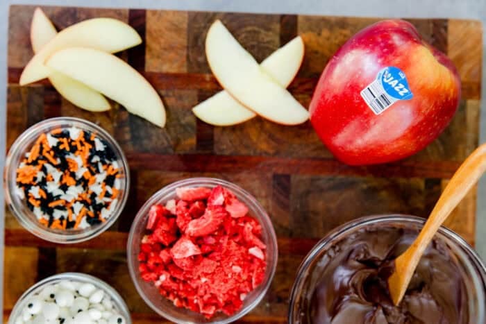 Set up your sliced apple bar with bowls or mini cauldrons of toppings for a festive vibe. We love balancing fun options (like candy eyes, sprinkles, crushed cookies, and mini M&Ms) with wholesome ones (like freeze-dried strawberries, chopped nuts, shredded coconut, and granola). For dips, offer melted red chocolate, dark chocolate, and warm caramel to cover both indulgence and balance.