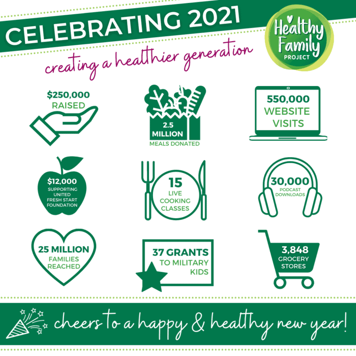 In addition to donations raised, Healthy Family Project is celebrating overall impact made reaching 25 million families through the Healthy Family Project website, social media and other digital communications. In 2021, Healthy Family Project implemented refreshed signage in 3,848 grocery stores, surpassed 30,000 unique downloads of the Healthy Family Project podcast, produced 15 Live cooking classes with the organization’s junior chefs and saw more than a half million website visits to healthyfamilyproject.com.