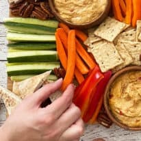 A: Bell Peppers are packed with vitamin C to support immunity. The also provide vitamin B6, folate and antioxidants like beta-carotene. Cucumbers are very hydrating with a high water content. They also provide vitamin K, molybdenum, antioxidants and are low in calories. Our hummus is made from chickpeas which are an excellent source of plant-based protein and fiber. Our hummus also contains healthy fats, folate, iron and other minerals. So our hummus snack board delivers vitamins, minerals, antioxidants, protein, fiber and healthy fats in a fun, festive way! And, the veggies add crunch and freshness. You just have to make it and see why it’s so delicious!
