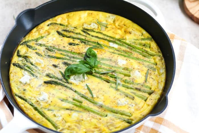 Packed with crisp-tender asparagus, creamy goat cheese, and protein-rich eggs, this dish feels like a treat but comes together in under 30 minutes. It’s perfect for feeding a hungry crowd, prepping meals for the week, or sneaking a few extra veggies onto your family’s plates, no complaints here!