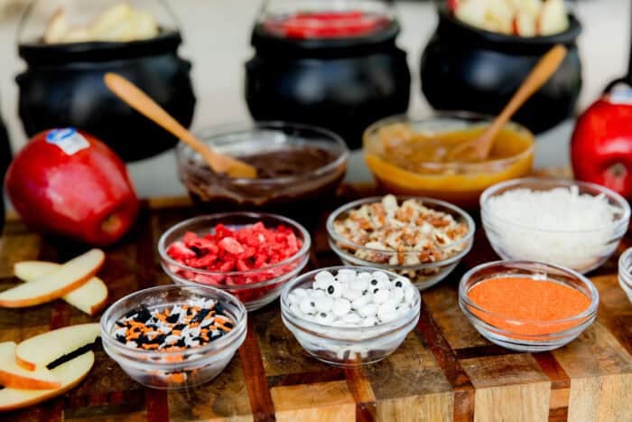 Set up your sliced apple bar with bowls or mini cauldrons of toppings for a festive vibe. We love balancing fun options (like candy eyes, sprinkles, crushed cookies, and mini M&Ms) with wholesome ones (like freeze-dried strawberries, chopped nuts, shredded coconut, and granola). For dips, offer melted red chocolate, dark chocolate, and warm caramel to cover both indulgence and balance.