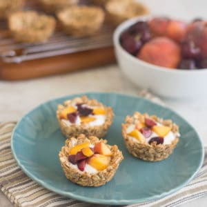 • Fill granola cups with yogurt and top with cherries and peaches.